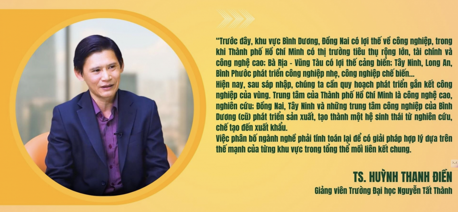 Việc sáp nhập địa giới tạo cơ hội để nhìn lại toàn bộ cấu trúc công nghiệp, từ đó tái cơ cấu các ngành sản xuất, quy hoạch lại không gian phát triển và tăng cường kết nối giữa các khu vực. TS. Huỳnh Thanh Điền nhấn mạnh, công nghiệp hỗ trợ không thể chỉ tính trong phạm vi một tỉnh hay một thành phố, mà phải được đặt trong tổng thể vùng Đông Nam Bộ, thậm chí gắn với các khu vực lân cận. Sự phân bố ngành nghề giữa TP. Hồ Chí Minh, Đồng Nai và Tây Ninh cần được tính toán lại trên cơ sở thế mạnh của từng địa phương, trong một chiến lược liên kết thống nhất.